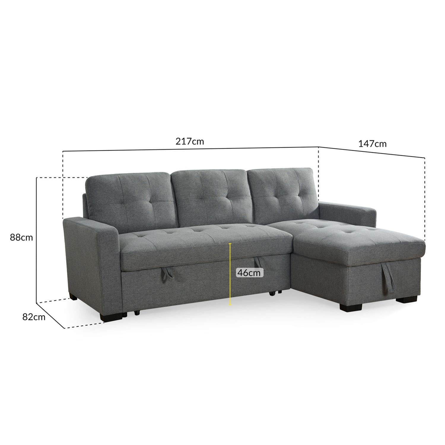 The Arden Corner Sofa Bed is a versatile and practical addition to modern living spaces, combining style, comfort, and clever functionality. Upholstered in a contemporary grey fabric, this L-shaped sofa bed seamlessly fits into various interior styles whilst providing flexible seating and sleeping solutions. The universal corner design allows the chaise to be positioned on either the left or right side, adapting perfectly to your room layout. Hidden within the chaise is a spacious lift-up storage compartment, ideal for storing bedding, cushions, or other household items, helping you maintain a tidy living area. When guests arrive, the sofa effortlessly transforms into a comfortable pull-out bed with a sleeping area of 190 × 116 cm, suitable for two people. Built with supportive cushioning and a sturdy frame, the Arden delivers reliable comfort for both everyday lounging and overnight stays. Measuring 88 cm in height, 82 cm in depth, and 217 × 147 cm overall, this sofa bed is perfect for guest rooms, living rooms, apartments, and any space-conscious home where maximising functionality is essential.
