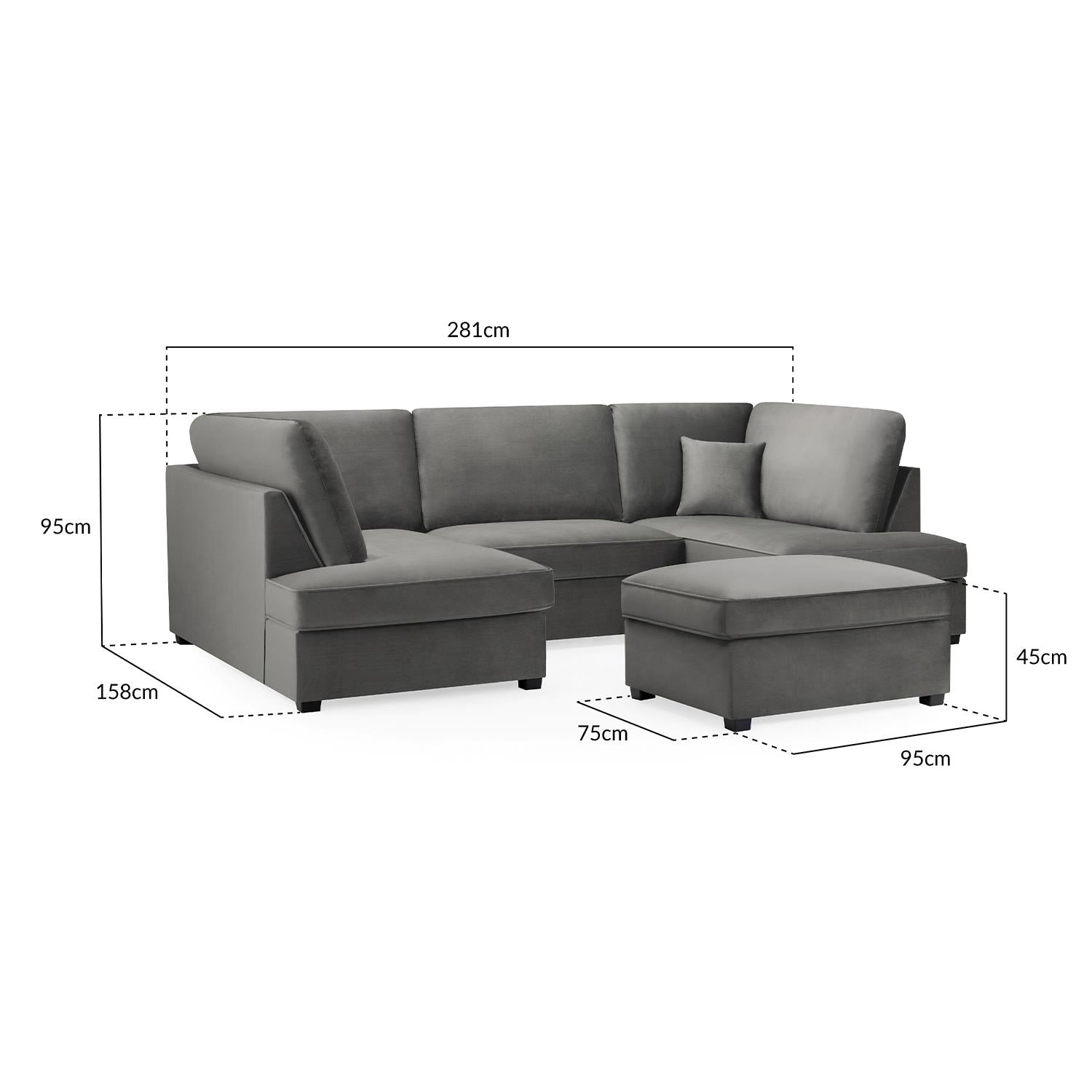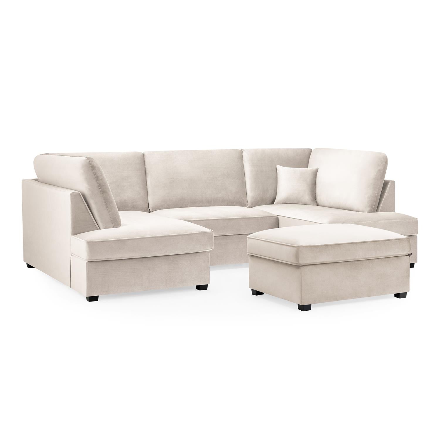 Upgrade your living room with the California U-Shaped Sofa with Footstool, designed for maximum comfort and modern style. This spacious U-shaped corner sofa offers cinema-style lounging with deep seating and full, supportive back cushions, making it ideal for relaxing evenings, movie nights, and entertaining guests. Upholstered in soft, luxurious plush velvet, the California adds a premium feel to your space while remaining practical for everyday use. Finished with detailed piping and sturdy wooden feet, it brings a sleek, contemporary look to any living room. With removable back cushions and delivery in four easy-to-handle sections, this sofa set is the perfect blend of comfort, style, and convenience.