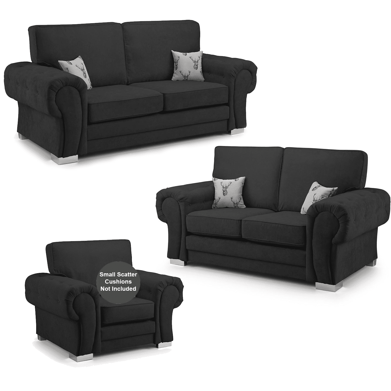 This 3-piece sofa set is upholstered in a premium fabric with chrome feet. Comes with scatter cushions. Supplied with foam seating cushions for longevity and comfort.