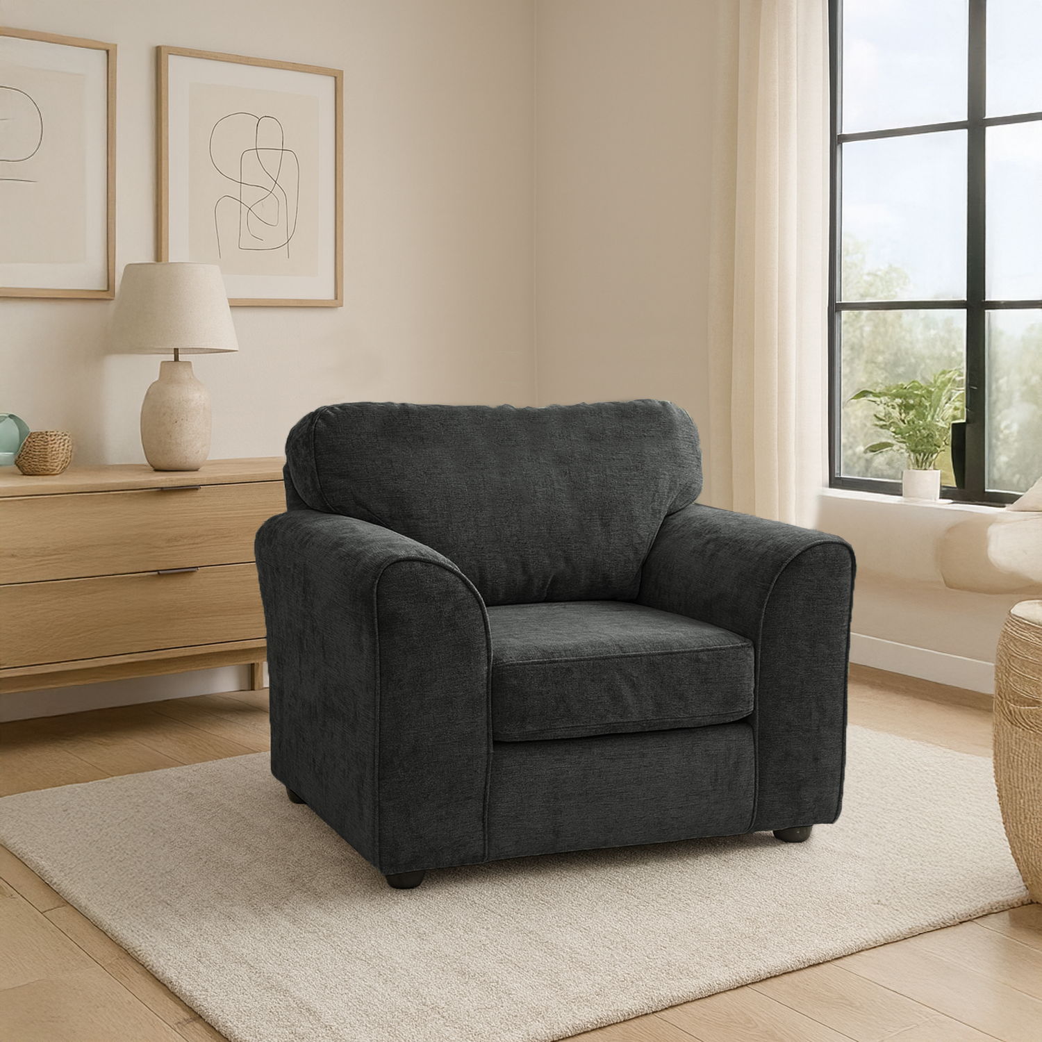 - Upholstered in chenille fabric.