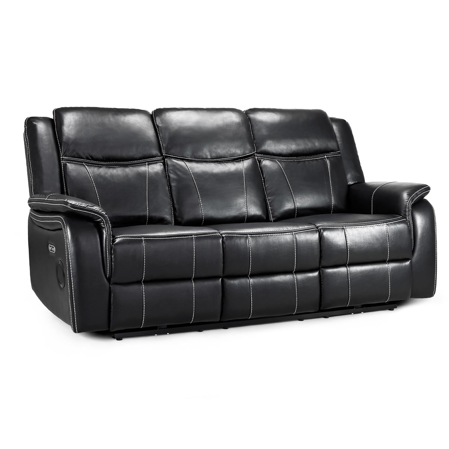 Create a stylish home cinema setup with the Orlando Electric Reclining Sofa Set, featuring a spacious 3 seater with reclining end seats and two matching reclining armchairs. Smooth power recline, padded arms, and supportive backs deliver everyday comfort, while built-in USB charging ports keep your devices powered as you relax. Upholstered in sleek leather-look material with detailed stitching, this coordinated suite brings a modern finish to your living room. Easy to assemble with backs that click into place and simple wipe-clean care make it a practical choice for everyday living.