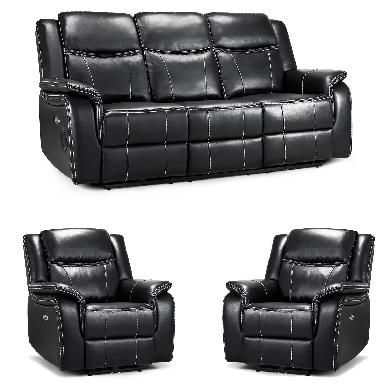 3 Piece Recliner Set – Includes 1 x 3 seater electric reclining sofa and 2 x matching reclining armchairs.