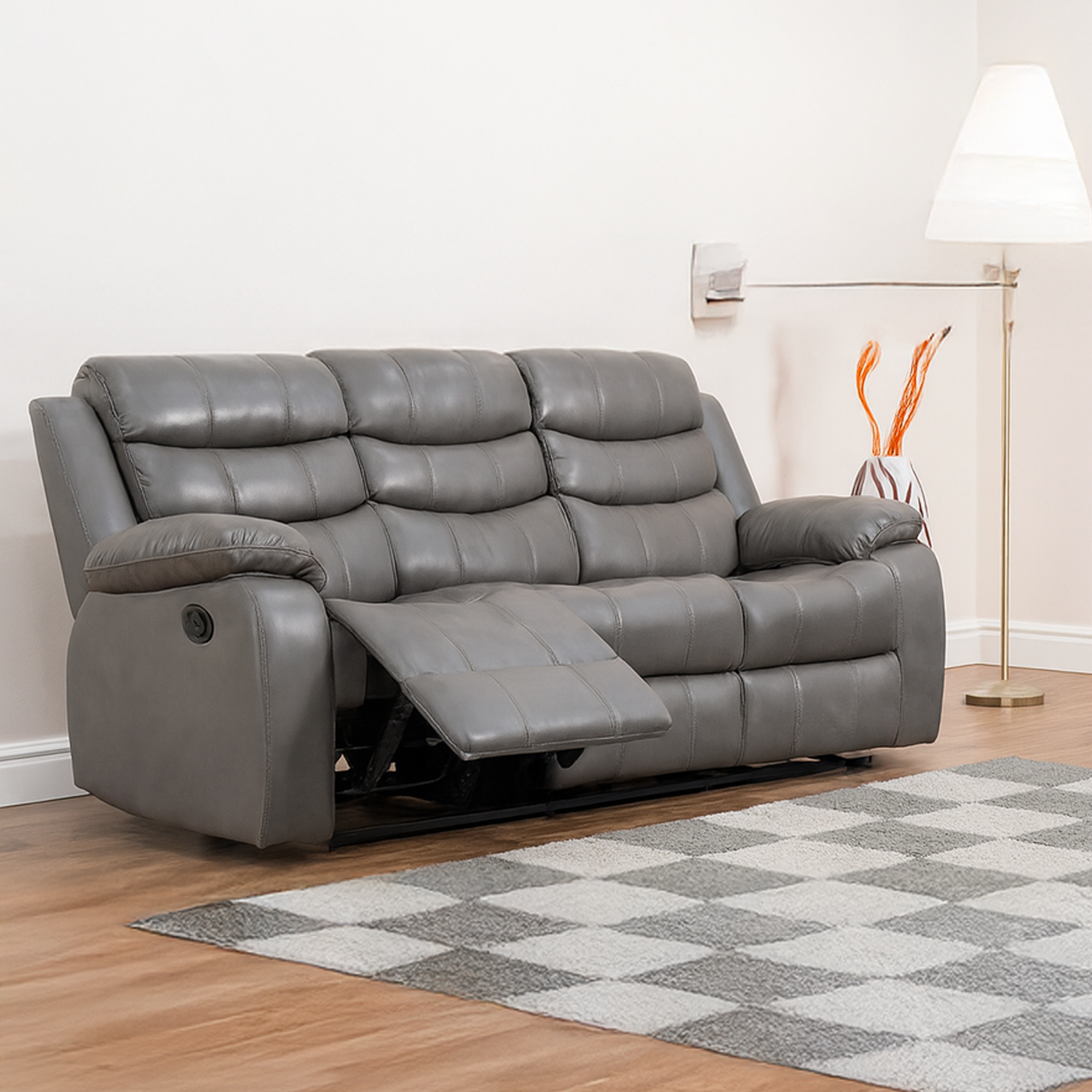Upholstered in premium leatheraire. This reclining sofa suite includes 3 seater. The design is made for comfort. It includes luxuriously padded arms and a manual 3-positioning recliner function. Middle seat on the 3 seater does not recline.